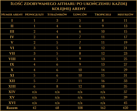 - zmiany w liczbie i sposobie zdobywania aitharów - im dalsze areny, tym więcej aitharów gracz zdobędzie za ich ukończenie. Dokładne ilości przedstawia poniższa tabela.