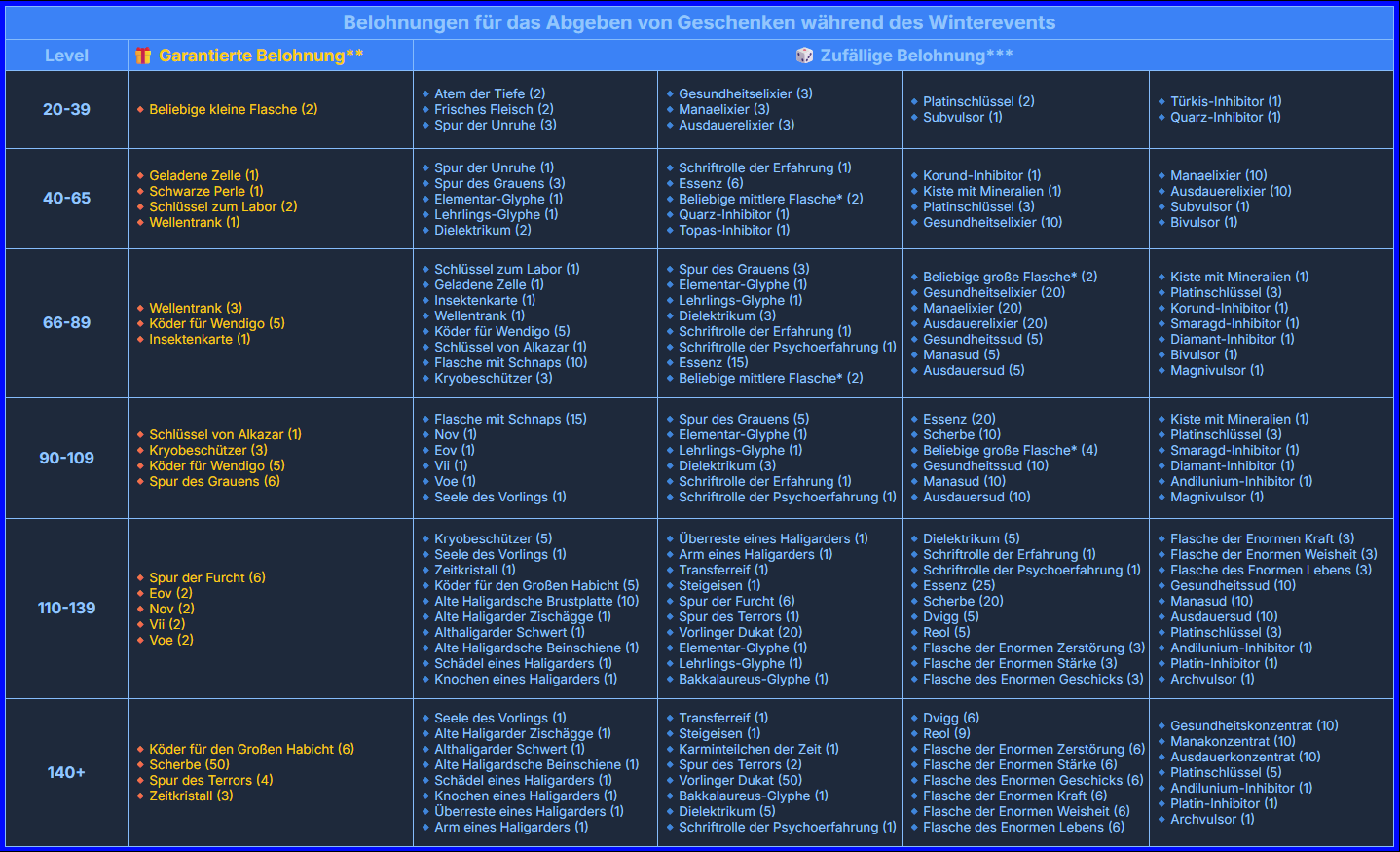 Der alte Wintervater und der Weihnachtsmann werden in Trentis, Alaril, auf der Hochebene und in Beirn erscheinen. Sie geben euch Aufträge, die in ihrer Schwierigkeit und Belohnung variieren.