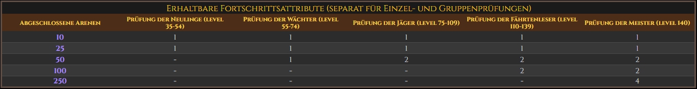 Fortschrittsattribute können erhalten werden, indem Prüfungen abgeschlossen werden oder, falls die Prüfung fehlschlägt, für das Abschließen einer gewissen Anzahl an Arenen. Die Anzahl der Arenen, die ihr abschließen müsst, um Punkte zu erhalten, wird in der folgenden Tabelle gezeigt: