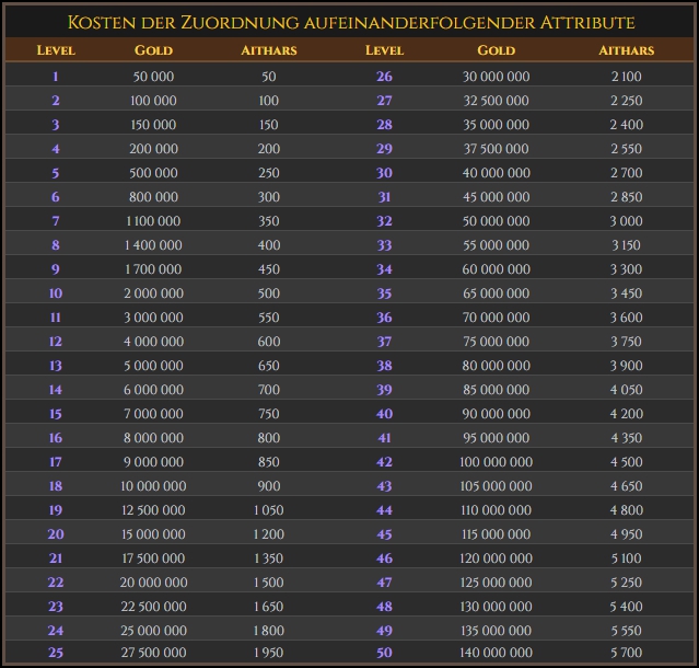 Die Kosten des Kaufs von fortschreitenden Attributen sind wie folgt: