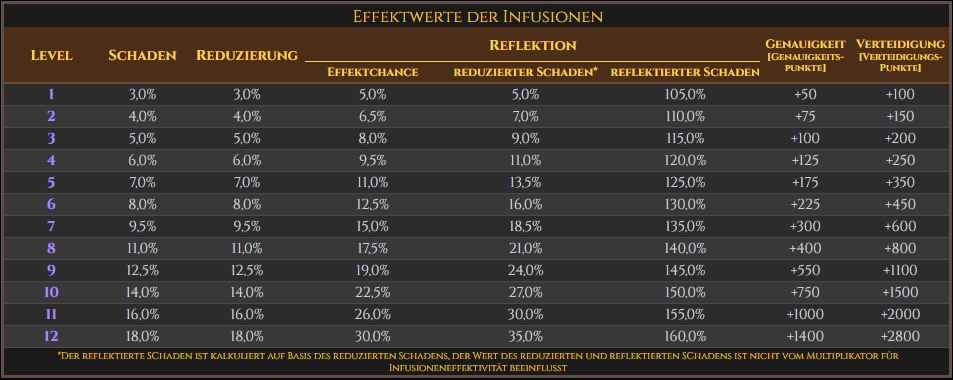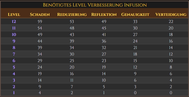 - Ausrüsten eines seltenen Ausrüstungsgegenstandes, Setteils, Epics oder legendärer Waffe. Infusionen werden auf dem Level gedeckelt, der dem Rang der ausgerüsteten Waffe entspricht.