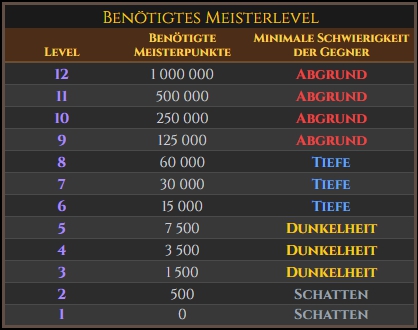 - Meisterlevel erhalten - Besiegen von Gegnern mit diesem Aspekt (sowohl in den Prüfungen als auch außerhalb) gibt euch Meisterpunkte, die folgende Level freischalten. Die Anzahl an Punkten, die für jedes Level benötigt werden:
