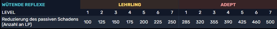 - Änderung des Spezialskills Wütende Reflexe - anstatt der Aufhebung des passiven Schadens wird es nun den Verlust der LP durch diesen verringern um den Wert des bestimmten Levels.