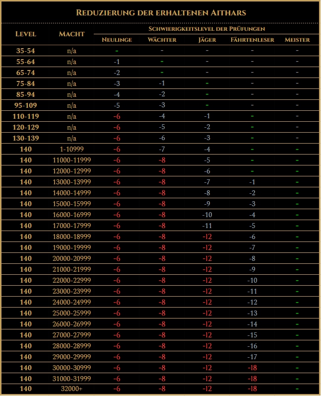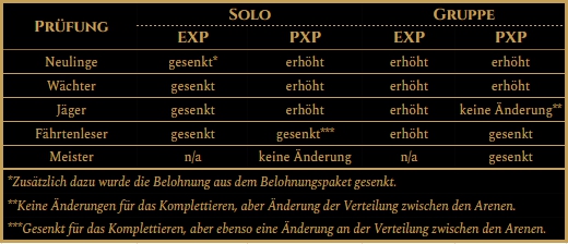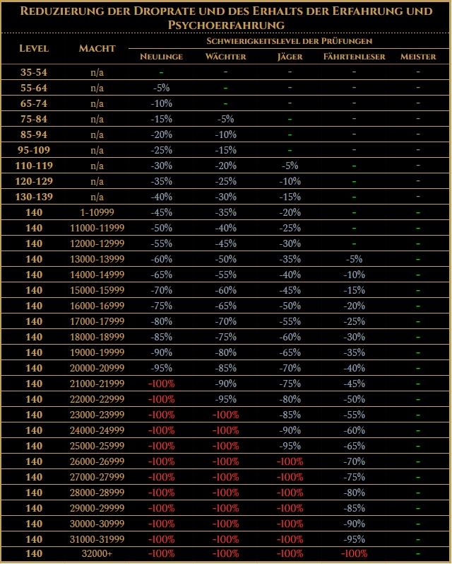 Einführung der Reduzierung von Prüfungsbelohnungen abhängig vom Spielerlevel (bis Level 139) oder Macht (auf Level 140). Folgendes wird reduziert: Erfahrung, Psychoerfahrung, Droprate von Gegenständen und Ausrüstung, Aithars für das Abschließen von Arenen. Die Reduzierung hängt von den stärksten Spielern in der Gruppe ab und sieht wie folgt aus: