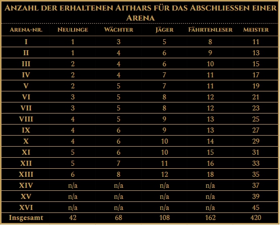 - Veränderung der Anzahl an erhaltenen Aithars und die Art, wie man sie erhält - je weiter die Arena, desto mehr Aithars können für das Abschließen erhalten werden. Die genauen Mengen können in der folgenden Tabelle eingesehen werden.