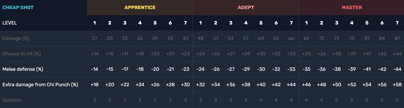 - Cheap Shot - it’ll complement Front Kick's debuff and empower Chi Punch