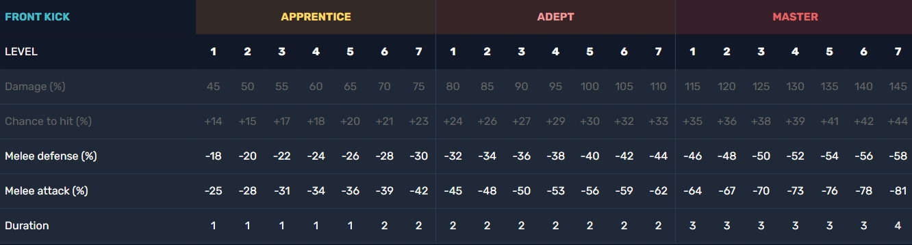 - Front Kick - returns as an opener. It’ll get a more powerful (versus what you saw on the PTR) debuff that lowers melee defense. This is because, in their debuffer role, Sheeds attack last