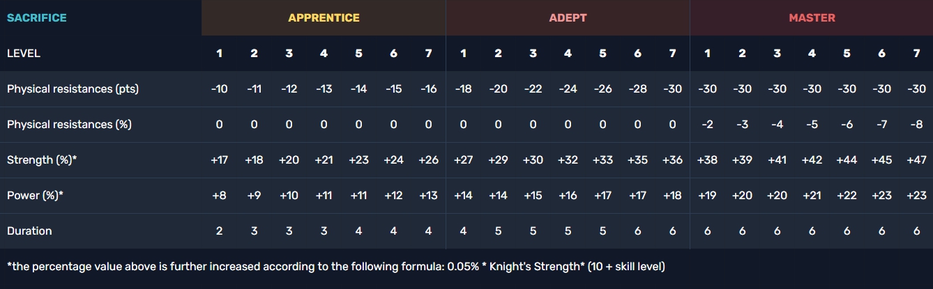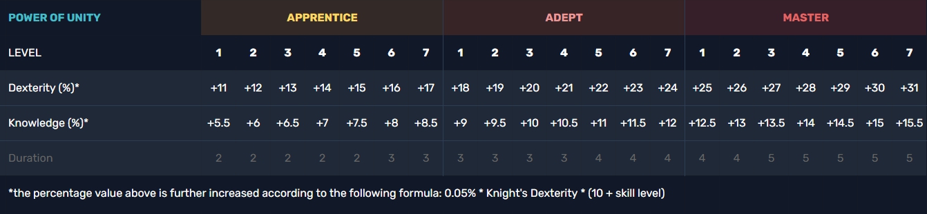 - Sacrifice and Power of Unity - they’ll now boost attributes: Sacrifice will increase strength and power while Power of Unity increases dexterity and knowledge. The more strength the Knight has, the bigger the bonus from Sacrifice. The effect of Power of Unity, on the other hand, is affected by the Knight’s dexterity. After PTR2, we decided that the power of the buffs should scale more with skill level so that lower levels can benefit from them more. Apart from that, we removed the physical hit chance modifier from Sacrifice to make it equally beneficial for magical and physical classes.