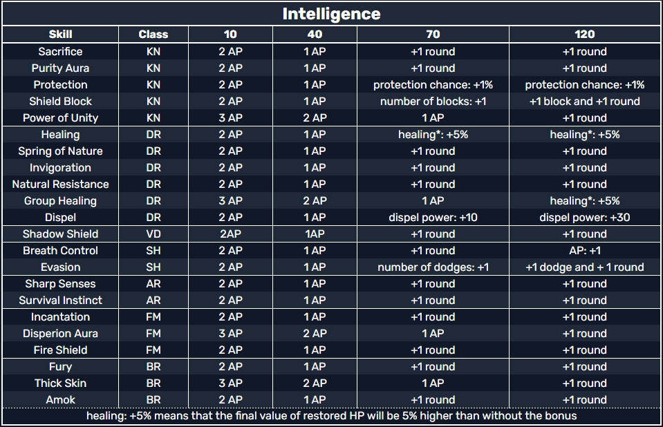 - Added Intelligence - a new attribute responsible for casting buffs that may also increase their duration. All skills will now have a constant AP threshold to be cast at 100%. This requirement can be lowered by investing in Intelligence. In addition to that, high Intelligence will extend the duration of buffs and/or improve their parameters (more details are available by mousing over the middle description of the buff in the Skills window).