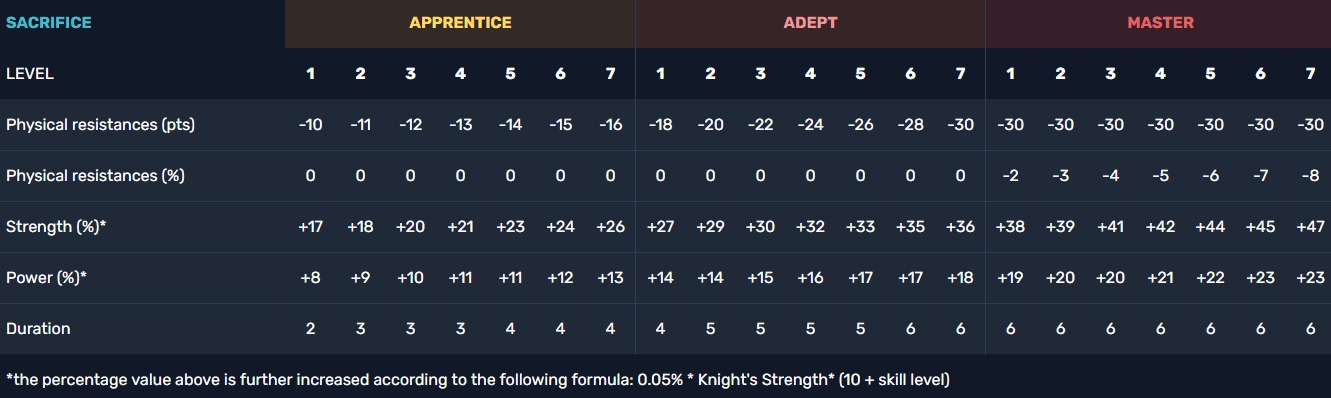 - Sacrifice - replaced the boost to damage by a boost to strength and power (the number of attributes added depends on the level of the skill, strength of the Knight, and strength or power of the target), removed melee hit chance modifier, changed values and added percentage resistance penalty at master levels.