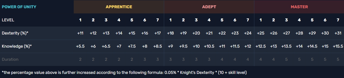 - Power of Unity - replaced the boost to damage and accuracy by a boost to dexterity and knowledge (the number of attributes added depends on the level of the skill, dexterity of the Knight, and dexterity or knowledge of the target).