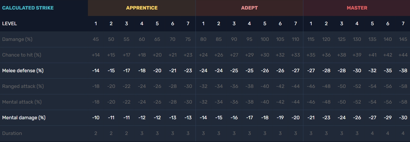 - Calculated Strike - added effects that decrease mental damage and lower the opponent’s melee defense.