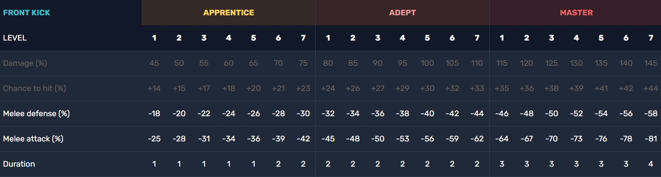 - Front Kick - nerfed the effect that decreased the opponent’s melee defense, added an effect that decreases their melee hit chance.