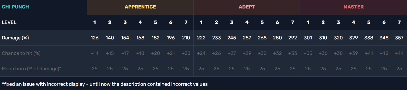 - Vicious Strike - removed the effect that lowered melee hit chance, added an effect that increases the damage of Chi Punch.