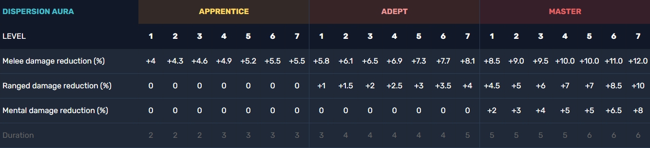 - Dispersion Aura - changed the damage reduction modifier (instead of sharing the effect with the drif alorn, it’ll now share the effect with the orbs Ba’ed, De’ed, and Ge’ed), varied the reduction for different zones, adjusted the values due to changes in the effect.