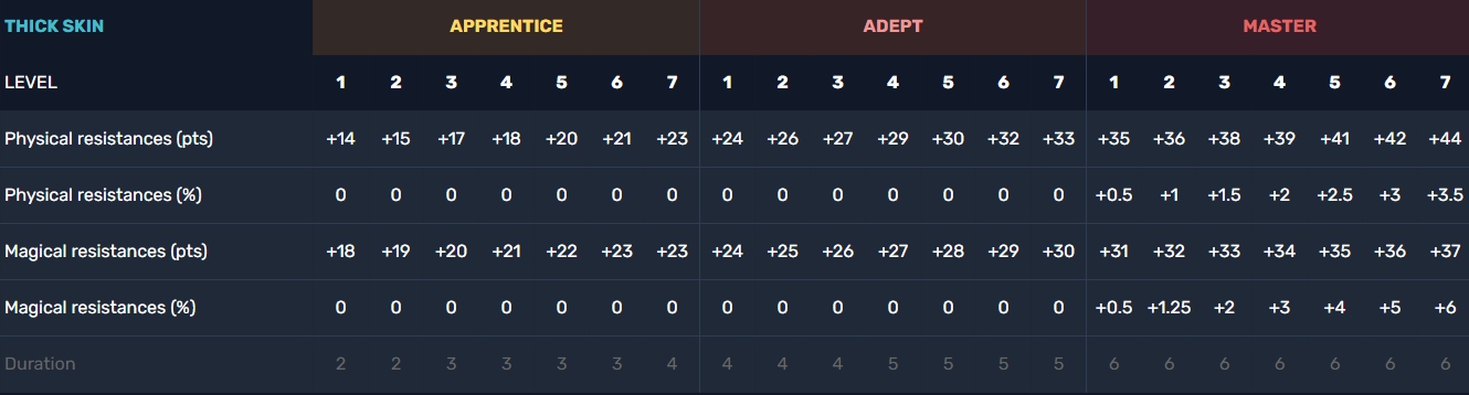 - Thick Skin - added percentage increase of resistances at master levels, decreased physical resistances added, and increased elemental and mental resistances added.