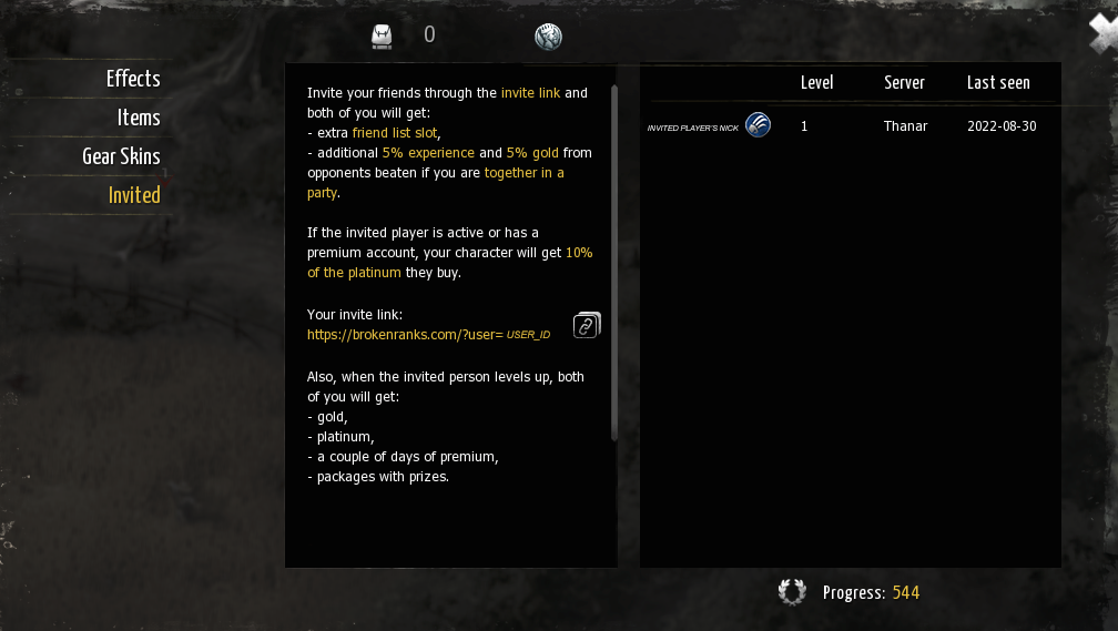 We want to make the gameplay of Broken Ranks even more enjoyable for you, so we’ve implemented an invite link system that provides useful bonuses to both parties. After all, making and tightening bonds is the basis for building a strong community (plus you get a lot of benefits for inviting more people, so it’s a win-win) ;)