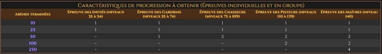 - Exploits : Maître des Épreuves (premier de votre classe dans le classement des Épreuves hebdomadaires), Meneurs des Épreuves (top10 de votre classe dans le classement des Épreuves hebdomadaires), Conquérant des Arènes de l’Épreuve (en terminant des arènes des Épreuves de la Loge).