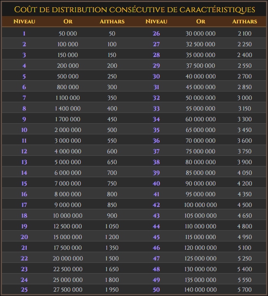 Le coût d’achat consécutif de caractéristique de progression est le suivant :