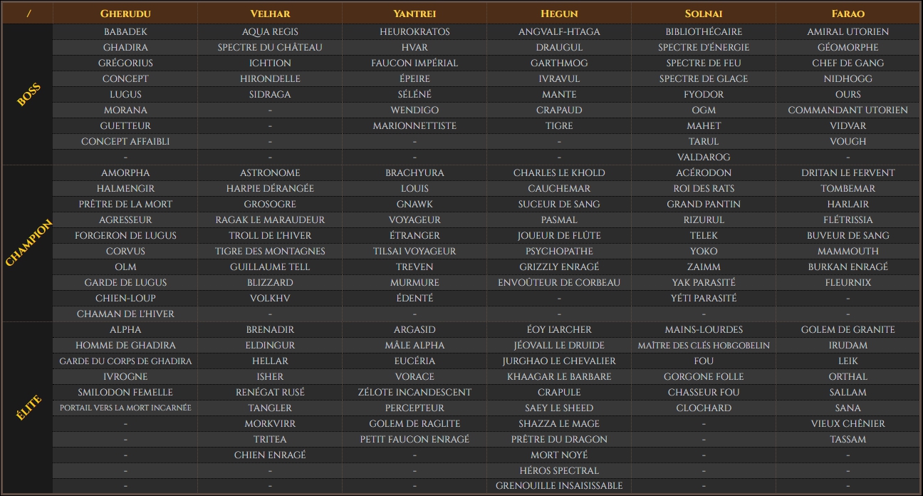 - Division des boss, champions, et élites en sept groupes distincts appelés aspects - l’aspect d’un adversaire sera visible dans sa fenêtre d’aperçu de groupe. Les adversaires sont divisés comme suit (le septième aspect n’a actuellement aucun membre) :