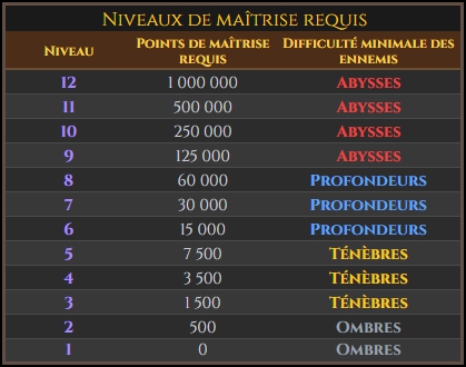 - Obtenir des niveaux de maîtrise : vaincre des adversaires avec l’aspect (aussi bien dans les Épreuves qu’en dehors) fournit des points de maîtrise qui débloquent les niveaux suivants. Nombre de points requis pour chaque niveau :