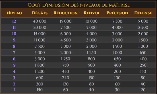 - Infuser des niveaux de maître : peut être effectué dans la fenêtre d’améliorations de la Loge disponible en parlant aux membres de la Loge se tenant à côté des portails. Un paiement en Aithars est nécessaire. Coûts des infusions comme suit :