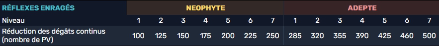 - Modification de la compétence spéciale « Réflexes enragés » : au lieu d’annuler les dégâts continus, elle réduira maintenant les PV perdues à cause d’eux par un montant dépendant du niveau donné ;
