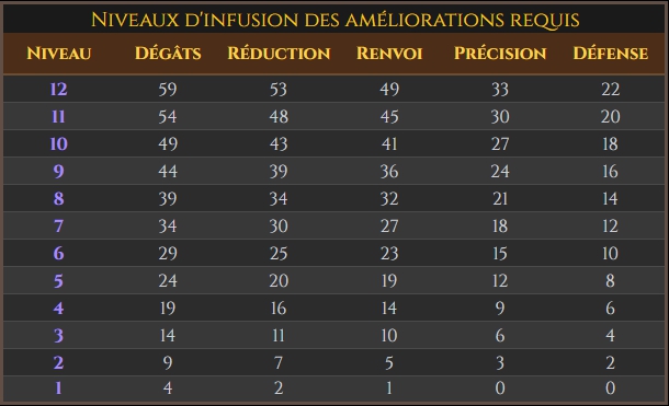 - Équiper une arme rare, d’ensemble, épique, ou légendaire. Les infusions seront limitées à un niveau égal au rang de l’arme équipée.