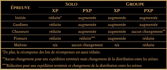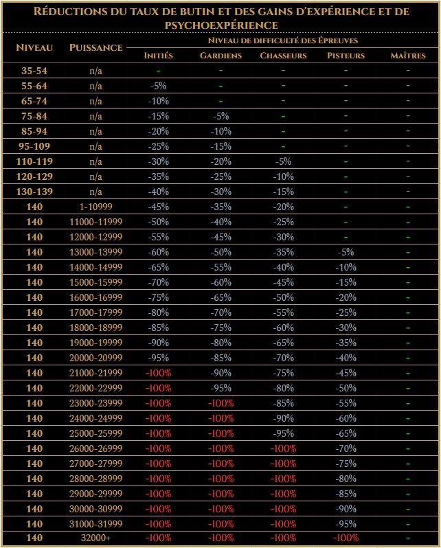 Implémentation de la réduction des récompenses des Épreuves par rapport au niveau du joueur (jusqu’au niveau 139) ou de la Puissance (au niveau 140). Les éléments suivants seront réduits : expérience, psychoexpérience, taux d’obtention des objets et équipements sur les créatures, aithars pour avoir terminé une arène. La réduction dépend du joueur le plus puissant dans le groupe et donne cela :