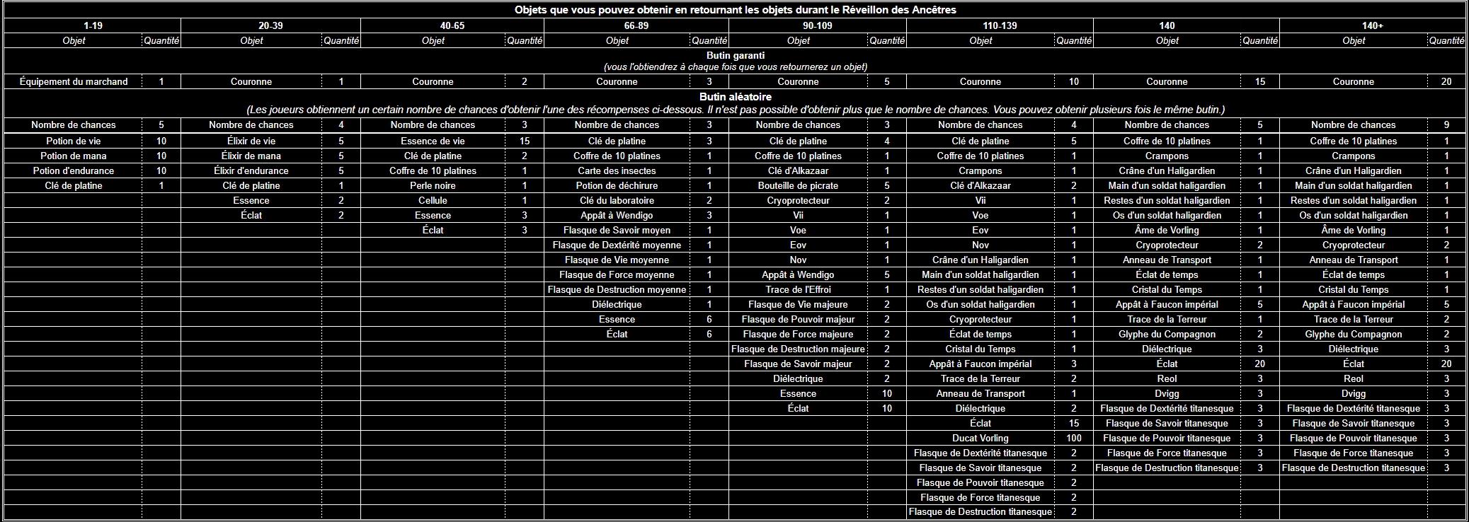 - Division de la tranche de niveau 140 en deux - elles différeront par la difficulté des mobs et les récompenses pour la remise des objets. Cependant, les récompenses données après chaque tour seront les mêmes et les points seront ajoutés au même pool, quel que soit l'objet remis et dans quelle zone pour ce niveau.