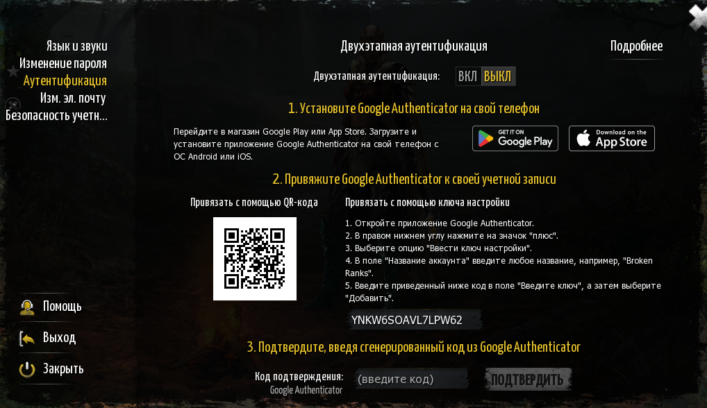 Включите аутентификацию, изменив переключатель в состояние “ВКЛ”. Появится короткая инструкция, показывающая, как установить и привязать свою учетную запись к приложению Google Authenticator. У вас будет два варианта на выбор: привязка с помощью видимого на экране QR-кода или переписать конфигурационный ключ в приложениe. После выполнения одного из этих действий в третьем пункте вы сможете подтвердить свое желание использовать двухэтапную аутентификацию, введя код, сгенерированный в приложении Google Authenticator, и нажав кнопку ПОДТВЕРДИТЬ.
