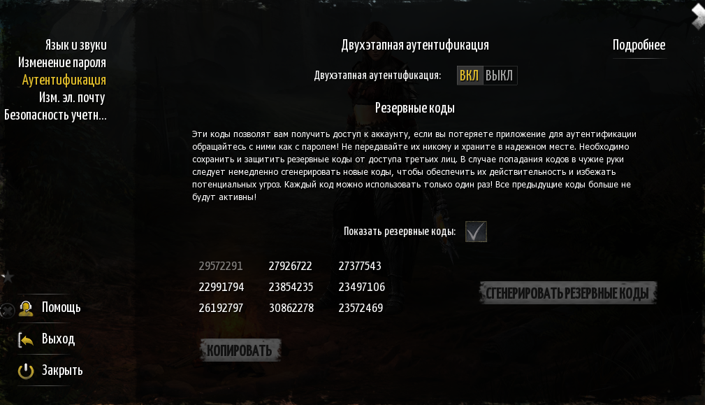Резервные коды — это уникальные случайные коды, которые вы получаете при включении двухфакторной аутентификации. Резервные коды позволяют вам войти в систему, если вы потеряете доступ к приложению для верификации. Вы найдете их во вкладке “Аутентификация”. Чтобы их увидеть, установите флажок “Показать резервные коды”, введите свой пароль от аккаунта и код из приложения Google Authenticator. Не забудьте записать коды в безопасном месте, недоступном для третьих лиц. Вы можете скопировать их одним щелчком мыши и сохранить в текстовый файл.