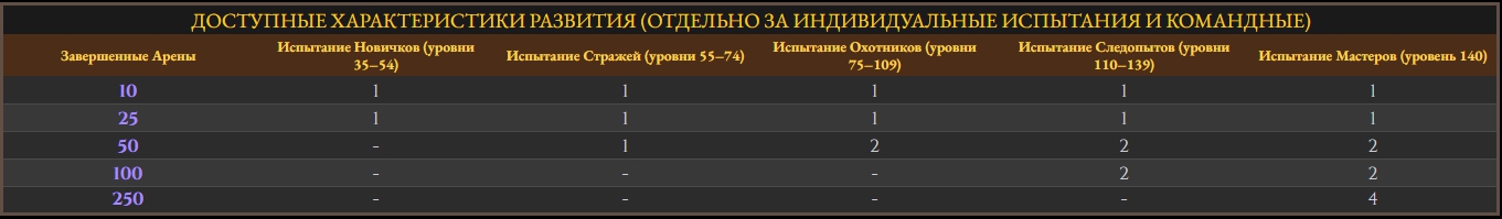 Характеристики развития можно получить за прохождение всего Испытания или за прохождение определенного количества арен. Количество арен, после которых вы получаете новые очки, представлено в таблице ниже: