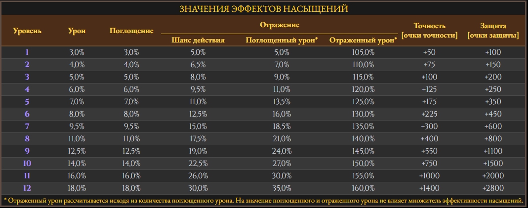 - Надетое редкое, наборное, эпическое или легендарное оружие. Насыщение действует максимум на уровне, равном рангу оружия.
