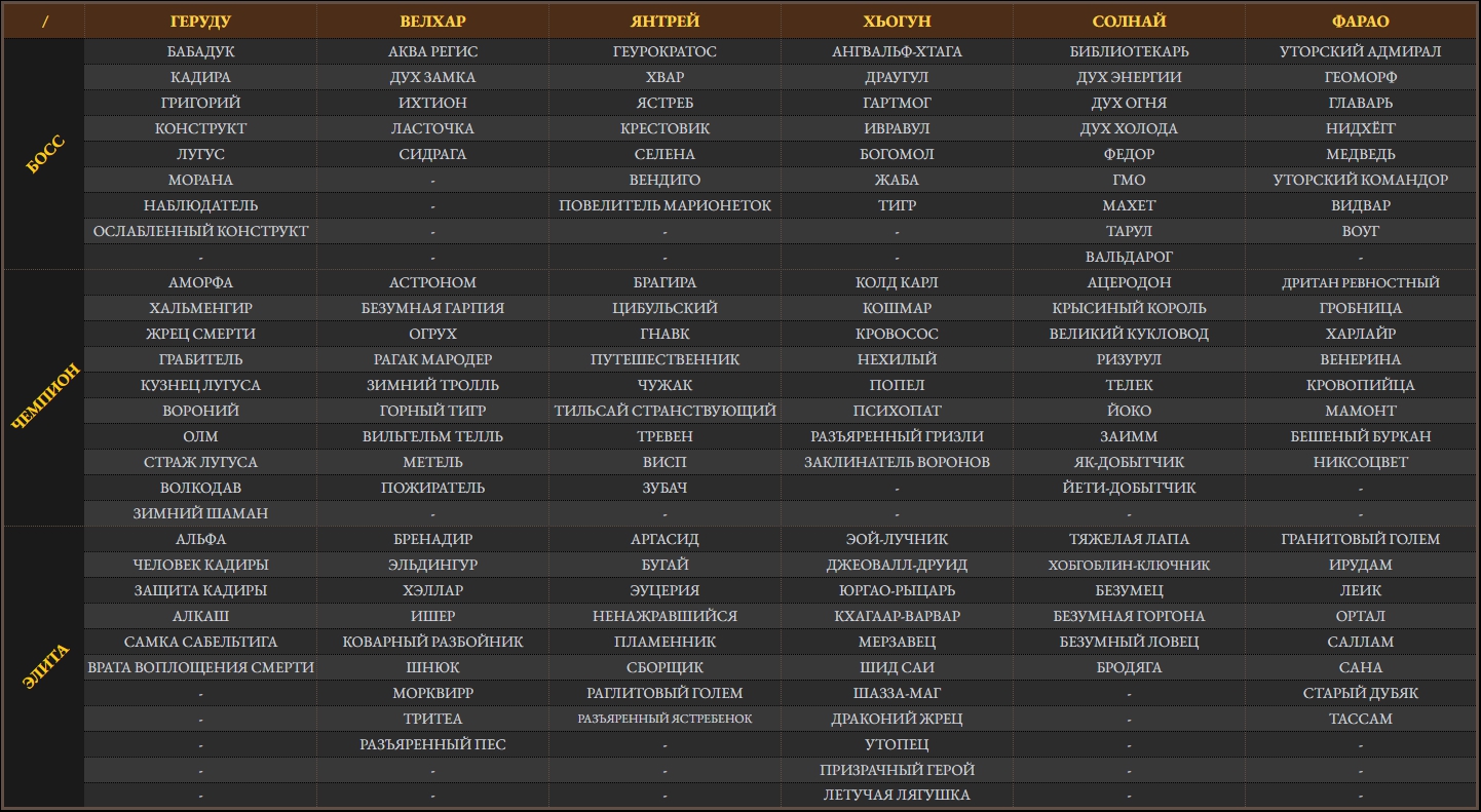 - Разделение боссов, чемпионов и элит на семь групп (аспектов). Аспект виден в окне просмотра команды. Разделение выглядит следующим образом: