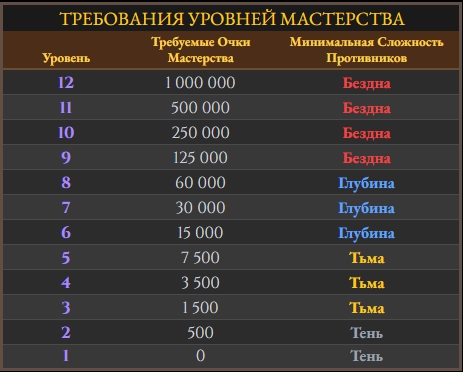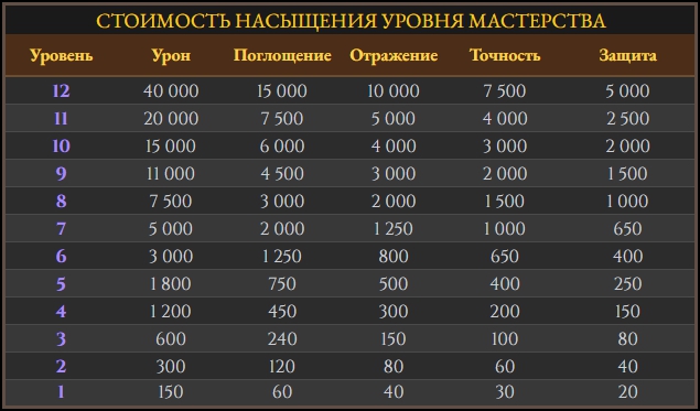 - получение уровня мастерства — победа над противником данного аспекта дает очки мастерства. Количество очков для каждого уровня: